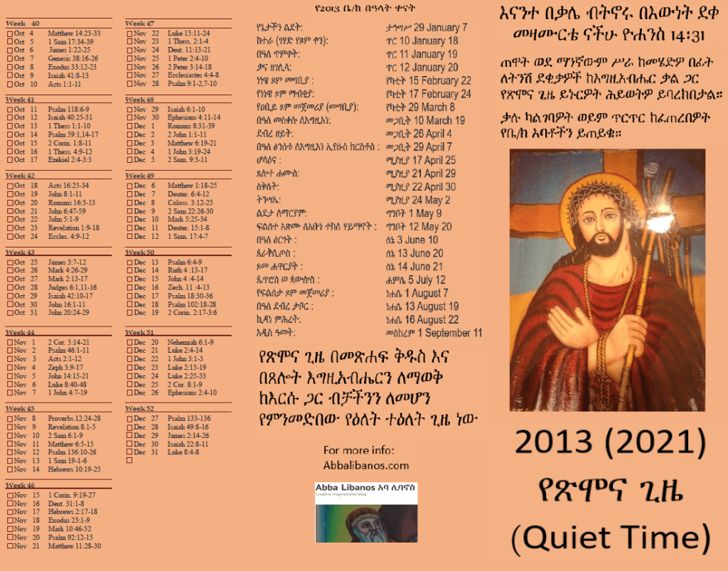 የጽሞና ጊዜ (Quiet Time) Posted byabbalibanosJanuary 4, 2021January 4, 2021Posted inመንፈሳዊTags:መጽሐፍ ቅዱስ, ኢትዮጵያ ኦርቶዶክስ Share this: Click to share on X (Opens in new window) X Click to share on Facebook (Opens in new window) Facebook Like Loading... Related